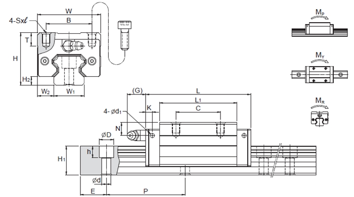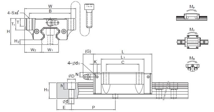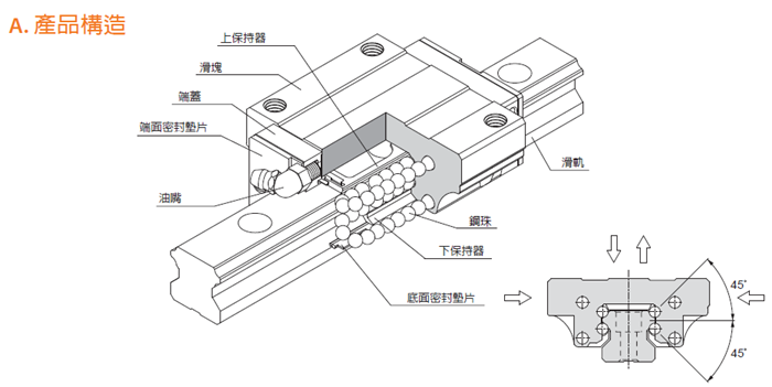 滑塊的高剛性斷面設(shè)計(jì)與4列鋼珠45°圓弧接觸角的設(shè)計(jì),除了提供徑向、反徑向及橫方向四方向的相同額定負(fù)荷能力,并且能夠施加足夠的預(yù)壓增強(qiáng)其剛性,適合各種安裝方式的應(yīng)用。