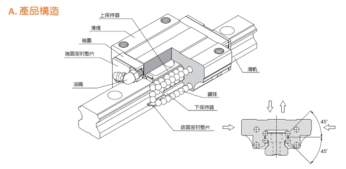 滑塊高度較低的斷面設(shè)計與4列鋼珠45°圓弧接觸角的設(shè)計,除了提供徑向、反徑向及橫方向四方向的相同額定負(fù)荷能力,并且能夠施加足夠的預(yù)壓增強其剛性,適合各種安裝方式的應(yīng)用。