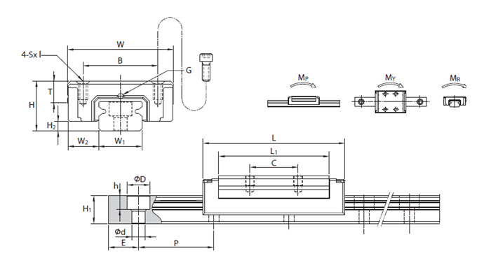 | 型號 | 導(dǎo)軌尺寸(mm) | 基本額定負(fù)荷 | 容許靜力矩 | 重量 | ||||||||||