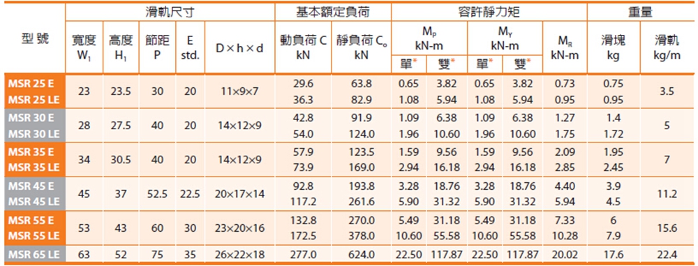 PMI銀泰MSR系列滾柱型直線(xiàn)導(dǎo)軌由于使用滾柱滾動(dòng)體取代一般的鋼珠滾動(dòng)體,因此在相同尺寸的直線(xiàn)導(dǎo)軌上可提供更高的剛性與負(fù)載能力,特別適用于講求高精度、高負(fù)載與高剛性的設(shè)備需求。