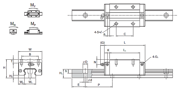 | 型號(hào) | 滑軌尺寸(mm) | 基本額定負(fù)荷 | 容許靜力矩 | 重量 | ||||||||||
