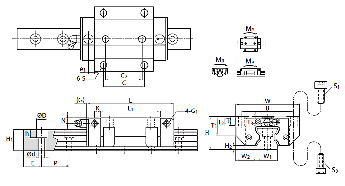 | 型號 | 滑軌尺寸(mm) | 基本額定負(fù)荷 | 容許靜力矩 | 重量 | ||||||||||