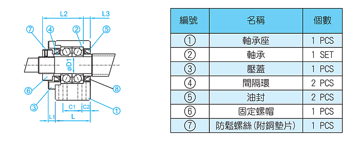 | 型號 | 軸徑 | A | B | C | C1 | C2 | E | H1 | h | H | L | L1 | L2 | L3 | T | P | N | M | X | Y | Z | 軸承型號 | ||||