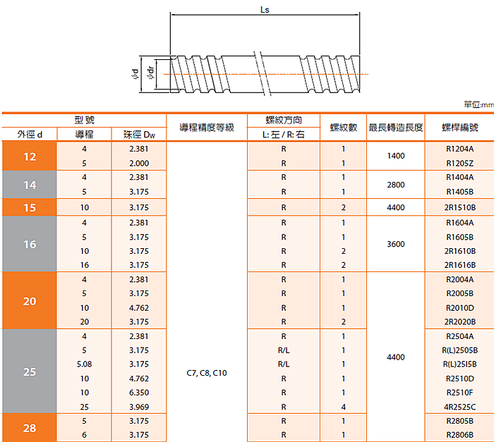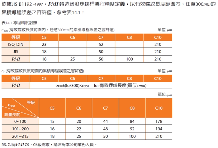 4---以實際需要確定滾珠絲桿精度。一般機械選C7以下即可,數(shù)控機床類選C5的比較多(對應國內標準一般是P5~P4和P4~P3級,具體參看樣本)。